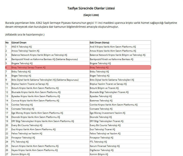 BİTAY tartışmasına ilişkin yeni bir gelişme yaşandı. Sermaye Piyasası Kurulu, “6362 Sayılı Sermaye Piyasası Kanunu’nun geçici 11’inci maddesi uyarınca kripto varlık hizmet sağlayıcılığı faaliyetine devam etmeyecek olan kuruluşlara dair kamunun bilgilendirilmesi amacıyla oluşturulmuştur” notuyla Tasfiye Sürecinde Olanlar Listesi’ni yayımladı.